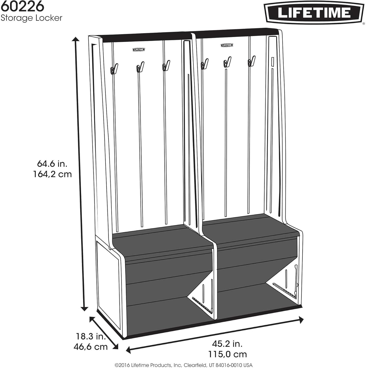 The Lifetime Storage Locker features blow-molded high-density polyethylene construction, (2) benches with storage compartments, (6) all-purpose hooks, & (2) built-in shoe shelves. Comes in gray matters & carbonized gray with a 5-year limited warranty. With UV-protected panels & benches, this lifetime storage Locker will not fade, crack or peel. Built to be strong & durable, it can be used as a bench. Easily anchor it to a wall to keep from tipping over. The attractive appearance & design is also weather & stain resistant for low maintenance usage. The easy, straightforward assembly even lets you connect multiple Lockers together. Constructed of UV-protected high-density polyethylene (HDPE).