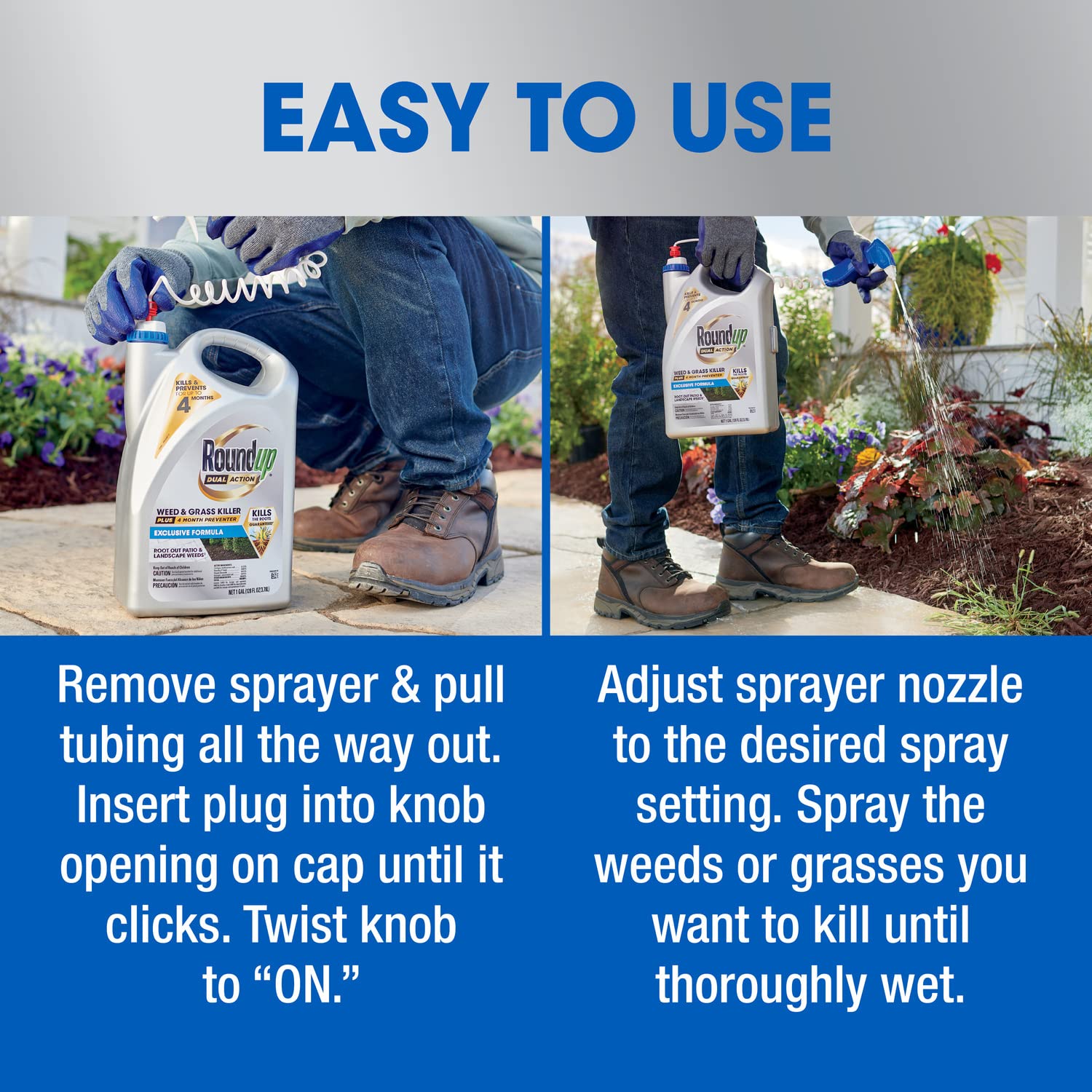 Kill even the toughest weeds and grasses with Roundup® Dual Action Weed & Grass Killer Plus 4 Month Preventer. This formula kills existing weeds and grass down to the root, and prevents new weeds from growing for up to 4 months by creating an invisible barrier in the soil. Apply only where you want to kill existing weeds AND prevent future weed growth for up to 4 months, such as cracks and crevices in driveways, sidewalks, and patios, along fences, in mulched beds or around the base of well-established desirable plants, shrubs, or trees, and on gravel areas. In order to prevent new weeds and grasses from growing, you must spray the entire area you want to control, not just the emerged weeds. For best results, apply during warm, sunny weather above 60°F. Rain or watering 30 minutes after application will NOT wash away effectiveness. After application, weeds will begin to yellow and wilt within hours with complete kill in 1 to 2 weeks. All ornamental bedding plants (annuals and perennials), trees, shrubs, sod and seed can be planted 4 months after application. One 1 gal. container of Roundup® Dual Action covers up to 300 sq. ft.